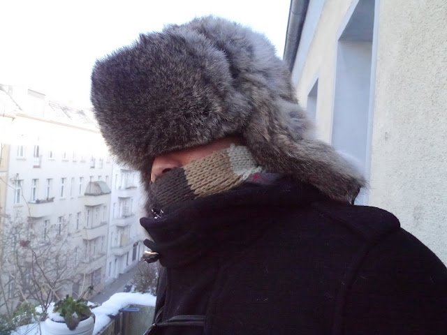 -13°C –– Parce que, à propos de mode, j’ai ne sors plus sans me coiffer d’un lapin mort ; c’est le comble du chic. Ce couvre-chef, en peau de lapin véritable, sent le lapin (heureusement, il ne sent pas particulièrement le lapin mort, juste le lapin tout court, sinon ce serait difficile…). Dans les rues, les chiens se retournent sur mon passage et reniflent dans ma direction avec excitation. Et ce renard affamé qui m’a pris en chasse l’autre jour au Treptower Park ? Flippant. Toujours est-il que cette toque en fourrure de lapin boréal me tient diablement chaud et c’est tout ce qu’il me faut. Et puis il est tellement doux, mon lapin mort, que je sens déjà que je suis en train de m’y attacher, et avec les températures qui remontent ça va être difficile de le remiser au placard.