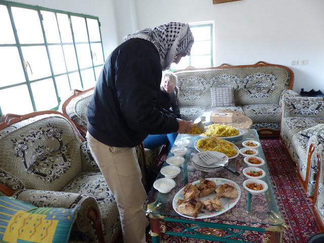 Financièrement, la situation n’est guère florissante pour la famille d’Abou Hamed. Les clients arabes se font extrêmement rares, vu que le magasin familial, au rez-de-chaussée de leur maison, se situe sur la portion de rue Shuhadah entièrement inaccessible aux Palestiniens, sauf ceux que les militaires israéliens du check-point daignent laisser passer : les habitants de la maison et quelques rares visages connus, dont notre guide. Pour leur survie, ils dépendent presque exclusivement des touristes étrangers qui viennent leur acheter quelques souvenirs ou menues bricoles de l’artisanat local. Ils complètent leurs revenus en cuisinant pour les visiteurs étrangers, qui payent 35 shekels, soit environ 7 euros, pour déjeuner dans leur salon et s’entretenir avec eux. C’était bon, simple, sain et, comme souvent chez les Arabes, extrêmement copieux. Abou Hamed et son fils aîné sont des hôtes divertissants. Un peu trop divertissants d’ailleurs, puisqu’au lieu de répondre à mes questions pressantes sur les horreurs de leur vie quotidienne, ils préfèrent plaisanter avec nous et faire les jolis cœurs devant les étrangères aux yeux bleus venues du Nord. Ils raconteront leurs misères une autre fois, lorsqu’ils auront moins de belles blondes à impressionner dans leur salon…