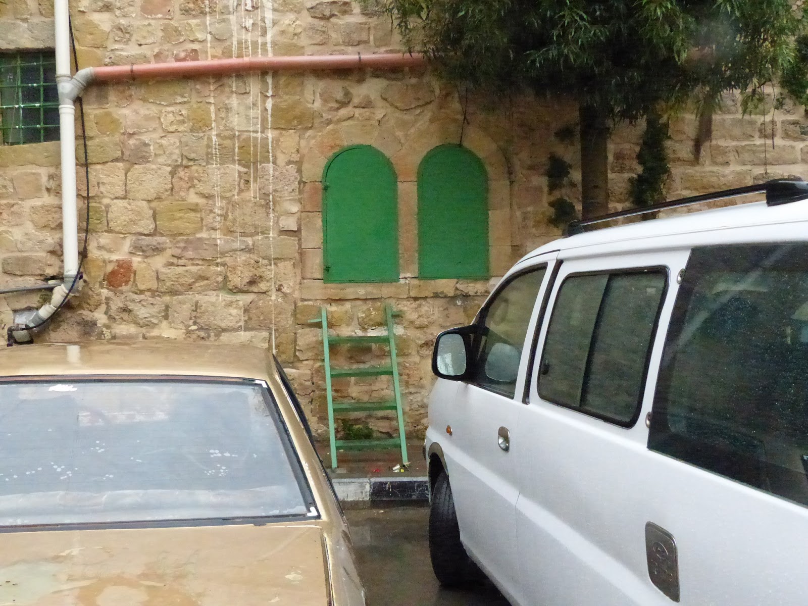 À notre arrivée à Hébron, Ammar gare la voiture sur un parking, et nous indique, au mur en pierre près de nous, des fenêtres peintes en vert vers lesquelles montent des échelles. Nous n’aurions probablement pas prêté la moindre attention à ces discrets aménagements, à l’apparence si anodine, si notre guide ne nous avait pas expliqué que les habitants de ces maisons ne peuvent plus utiliser leur portes d’entrée, mises sous scellés par l’armée israélienne pour assurer la «sécurité» des colons fanatiques. Pour entrer et sortir de chez eux, les malheureux résidents qui se sont retrouvés dans cette situation ont dû faire preuve d’inventivité : percer les arrière-cours, aménager les fenêtres ou, dans les cas les moins favorables, transformer leur toit en porte d’accès… C’est comme ça, que voulez-vous.