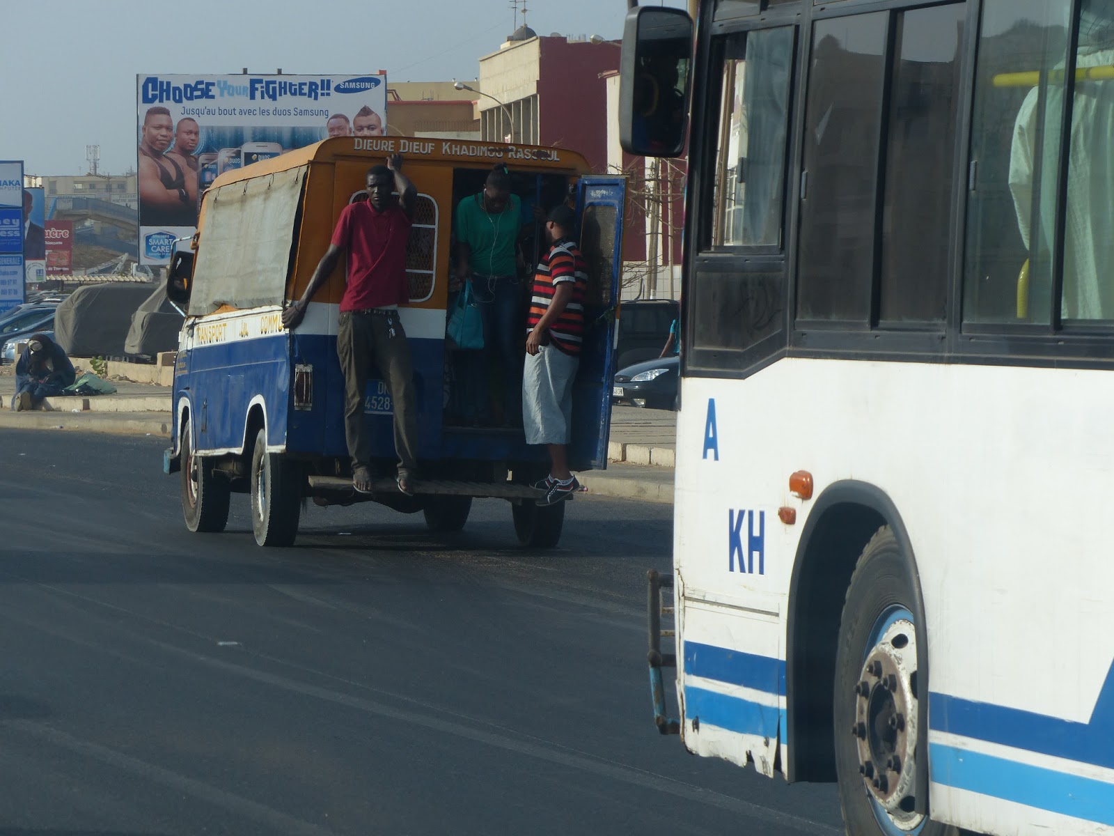 Dakar, c’est la couleur, l’énergie, l’effervescence. Les « cars rapides », ces antiques minibus décorés et bariolés, souvent dédiés à des « saints » protecteurs vénérés dans l’islam couleur locale, sillonnent les grands axes de la ville à l’allure prudente que leur autorisent leurs moteurs poussifs, que des mécaniciens improvisés ont réparés d’innombrables fois au cours du dernier demi-siècle. Leurs portes et fenêtres sont béantes, des passagers émergent de toutes les ouvertures et s’accrochant à l’extérieur du véhicule, perchés comme des trapézistes sur le point de s’élancer dans le vide, leurs mines pourtant placides et détendues, comme s’il n’y avait nul moyen plus confortable de voyager.