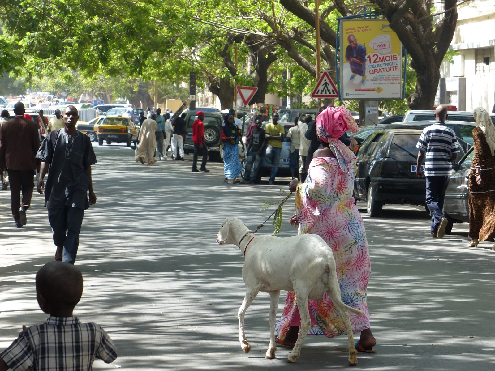 Des femmes africaines au port altier arpentent les rues avec d’un pas assuré, une aura princière émanant de leur auguste personne. Nombre d’entre elles sont vêtues du grand boubou aux couleurs chamarrées, une débauche de violets, de verts, de jaunes, de fleurs et de motifs bigarrés des pieds jusqu’à la tête. Quelle allure, mes aïeux, quelle prestance ! Les pieuses musulmanes préfèrent se draper de voiles moins aguicheurs à la manière des Arabes, certes, mais optent néanmoins pour des robes aux tons chatoyans et des foulards soigneusement assortis. Ou pas. Tant qu’il y a de la couleur, en fait, c’est l’essentiel… La femme sénégalaise, réputée dans toute la « sous-région » (l’Afrique de l’Ouest) pour son inimitable coquetterie, est très apprêtée et maquillée, et se pare volontiers de bijoux somptueux. Contrairement à sa cousine antillaise, elle évite généralement de se découvrir les bras, les jambes, les épaules, et a fortiori, le nombril ! Ici, féminité ne rime pas avec semi-nudité. Les hommes aussi affectionnent les couleurs vives et les imprimés, quoi qu’ils optent le plus souvent pour des tenues plus sobres et discrètes. Mais quelle orgie de couleurs ! Je ne me lasse pas d’observer et d’admirer cette foule grouillante et multicolore. Dakaroises et Dakarois font comme exprès de porter tant de couleur pour conjurer le gris-brun uniformisant du sable et de la poussière. Et je ne vous ai encore rien dit sur les animaux.
