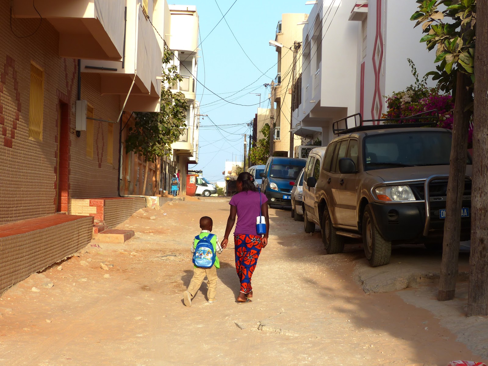 Dakar, c’est le sable. Et en prodigieuse quantité ! Le sable enveloppe et recouvre la ville, brunit les feuilles des cocotiers et des baobabs. Une pellicule de poussière grisâtre ternit l’éclat des fleurs tropicales, s’accroche opiniâtrement aux murs et aux portes, prend possession de nos chaussures et de nos vêtements. Le sable tourbillonne dans le vent, nous picote les yeux surpris par une bourrasque soudaine. Mais le plus remarquable, ce sont ces quartiers entiers de la capitale où les maisons et immeubles sont plantés à même le sable, là où ailleurs il y aurait de la pelouse ou des trottoirs… ou des chaussées asphaltées. Dans ces quartiers, les rues ne sont que des bacs à sable géants pour les enfantss, ou alors des arènes urbaines où les élégants mocassins du touriste peu averti et autres blogueurs fashion s’enfoncent pitoyablement tandis que ce dernier tente de garder contenance. Je n’ose imaginer le spectacle pendant la saison des pluies, de juin à octobre. Ça doit être sport.